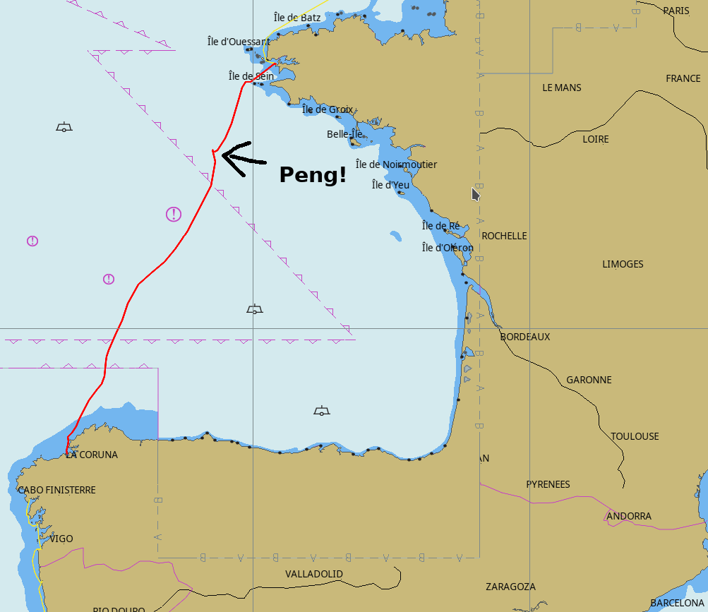 Der Angstgegner… Die Biskaya ist nicht ohne. Dadurch dass hier mehr oder weniger mitten in dieser großen Bucht die Wassertiefe von 3-4 Tausend Metern auf nur 1-2 Hundert Meter rapide abnimmt, können sich hier mörderische Wellen aufbauen, wenn man Pech mit dem Wetter hat oder nicht gut geplant hat. Das wurde schon so mancher Yacht zum Verhängnis. Geht bei uns alles Gut?